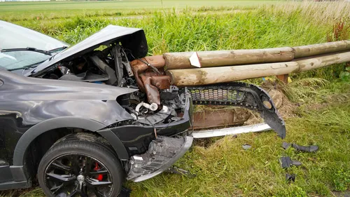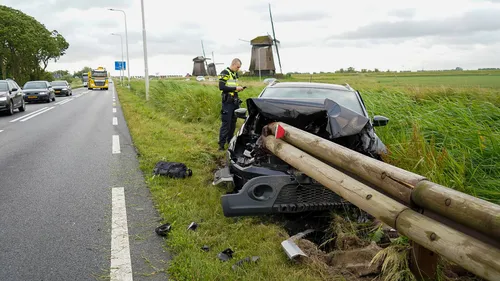 De auto die de vangrail raakte is zwaar beschadigd geraakt.