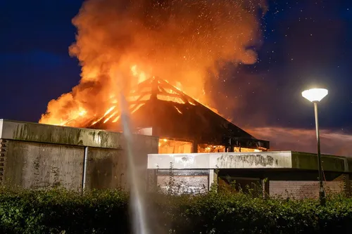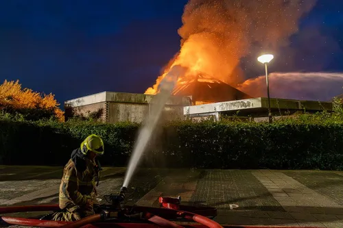 leegstaand schoolgebouw midden in de wijk, waar de vlammen inmiddels uitslaan.