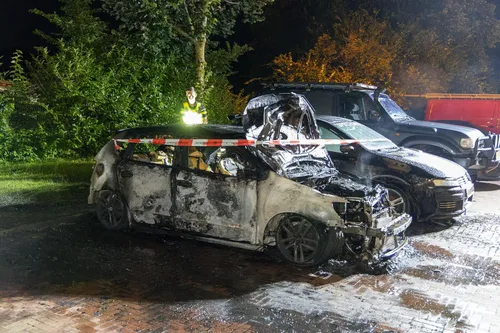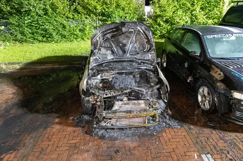de brand ging één voertuig volledig in vlammen op en een tweede voertuig raakte