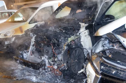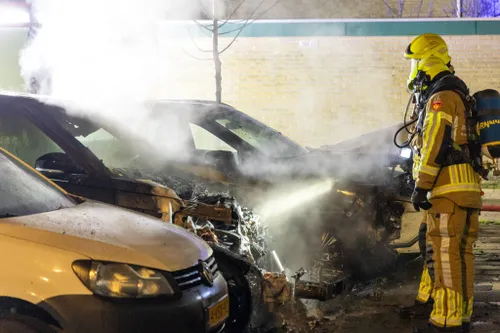verwoest door brand verwoest. Ook een derde voertuig liep schade op.