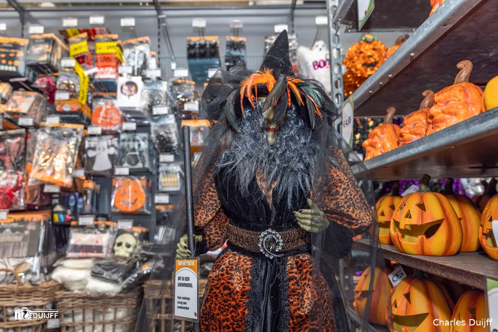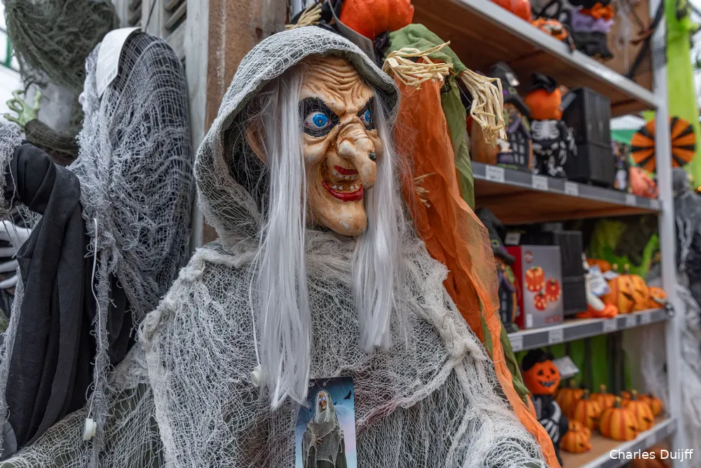 Waarom verhalen we van ons beangstigende avontuur? Nou eigenlijk om u achteraf gerust te stellen en aan te moedigen het Halloweenfeest 31 oktober aanstaande zelf te gaan beleven. Dat feest is geen dooie boel (al zou je dat wel denken), welnee het is spannend en de voorpret begint al wanneer je tuincentrum De Boet in Hoogwoud bezoekt. Daar is van alles aanwezig (en te koop) om uw Halloweenfeest tot een mega succes te maken. Voor jong en oud zeg ik erbij. Kijk nou eens naar onderstaande lieve oude dame, een beetje groen, maar dat komt omdat ze net is begonnen aan haar griezel-carrière. U wilt dat ik dat uitleg? Ja kom op mensen, ik heb meer te doen en ik kan niet heksen!